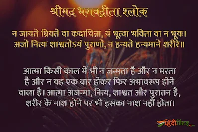 भावार्थ- आत्मा किसी काल में भी न जन्मता है और न मरता है और न यह एक बार होकर फिर अभावरूप होने वाला है। आत्मा अजन्मा, नित्य, शाश्वत और पुरातन है, शरीर के नाश होने पर भी इसका नाश नहीं होता।